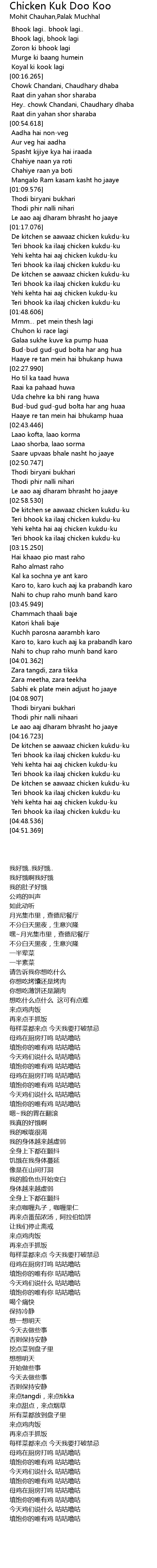 The Chicken Kuk-Doo-Koo song is strictly for non-vegetarians considering its title and lyrics that go Teri bhookh ka ilaaj chicken k uk-doo-koo de kitchen se awaaz chicken kuk-doo-koo. Today the chicken is saying that. Mohit Chauhan Palak Muchhal.